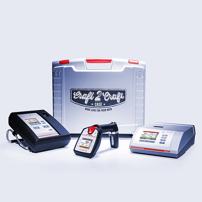 Craft2Craft 套装保证了精确的发酵控制、正确的酒精标签、保存期限内的高稳定性以及产品优良且一致的口感。该包装包括DMA 35密度计、CarboQCAt ‑line|CboxQC At‑line|OxyQC CO₂和O₂测试仪,以及Alex 500酒精和浸出物测试仪。