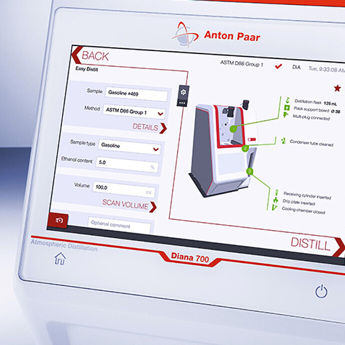 借助 Diana 700 的智能状态监控,我们已将您的测量设置自动化,并让手动操作成为过去。它针对不同的用户级别有不同的模式,包括适合初学者的“引导模式”和适合更有经验的用户的“高级模式”。前者将带您逐步完成仪器的启动程序,而后者将显示每个仪器组件的状态,让您直接进入蒸馏过程。