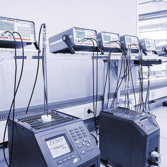 为了获得最高精度,可以使用石英和金属护套 SPRT 传感器,精度可达 1 mK。专为 Millikelvin 温度计设计的柔性 PRT 探头可用于校准 DMA 密度计或 SVM 粘度计。校准选项包括 ISO 17025、DAkkS、UKAS 或工厂标准,以确保实现最高质量的测量。