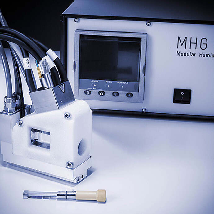 湿度样品台配有具有出色控制性能的模块化湿度发生器。样品附近经校准的相对湿度 (RH) 传感器和超精度 Pt100 温度传感器可在测量期间提供均匀且明确定义的湿度条件和更大温度均匀性。这是至关重要的,尤其是在高温和高相对湿度条件下进行研究时。