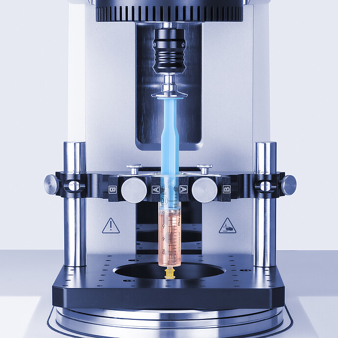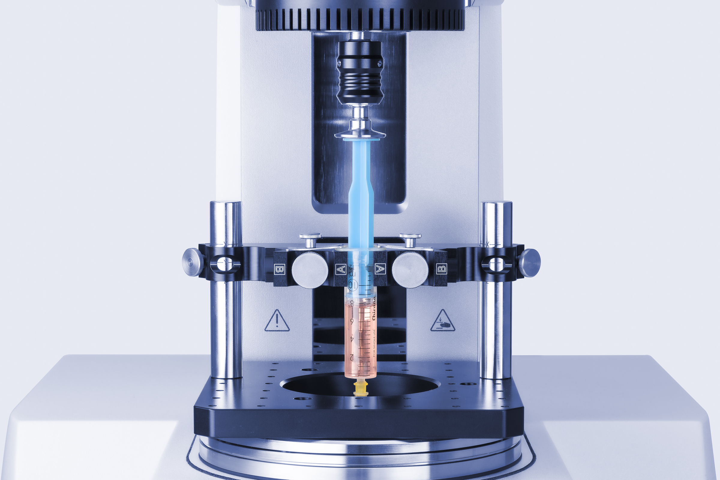 使用注射器测试支架将水从注射器中挤出,同时根据 ISO 7886-1 标准记录移动活塞所需的力。该装置包括高度可调节的注射器夹,以及用于收集挤出样品的储液罐支架。DIN ISO 7886-1 标准也被 USP<382> 和 USP<1382> 所引用。
